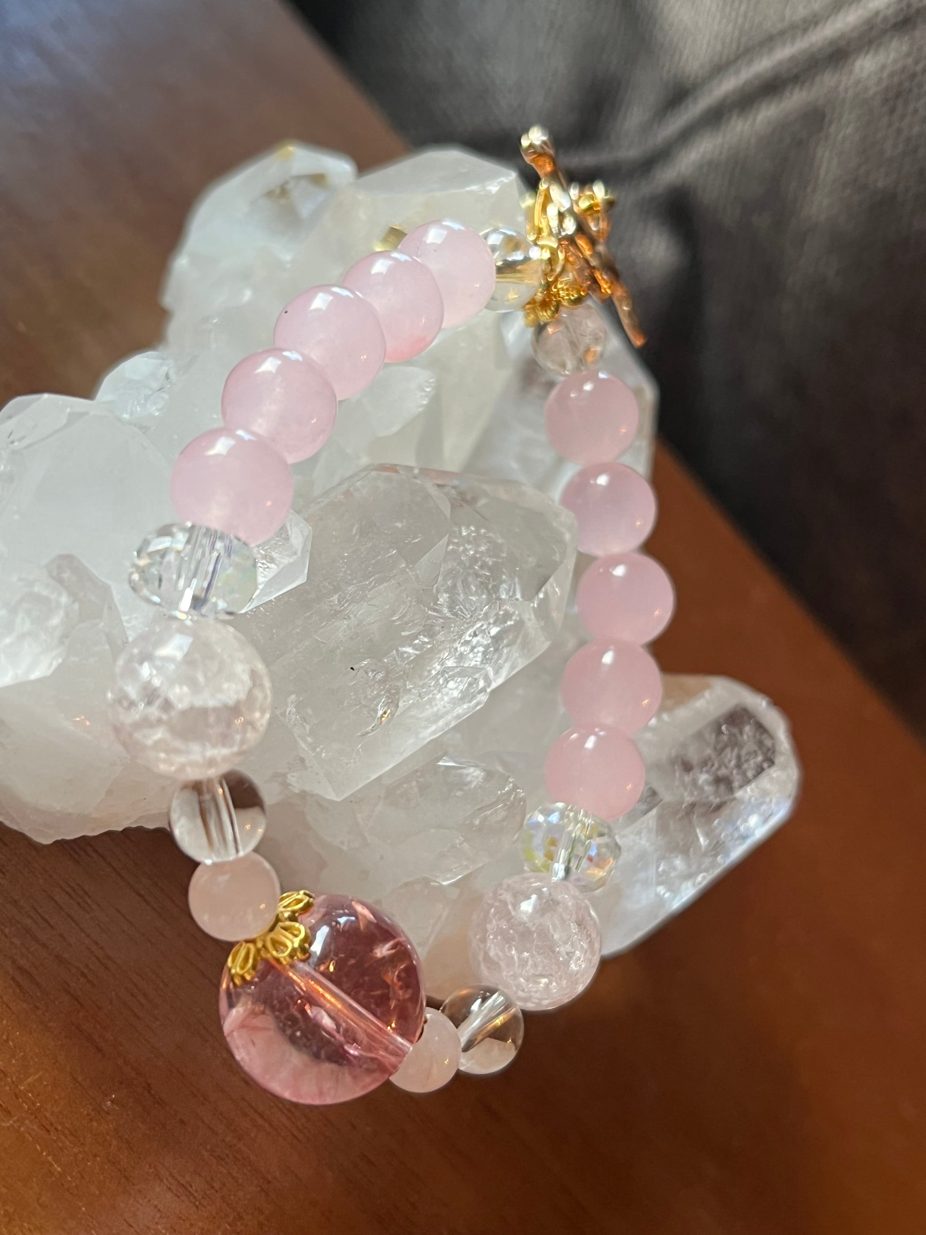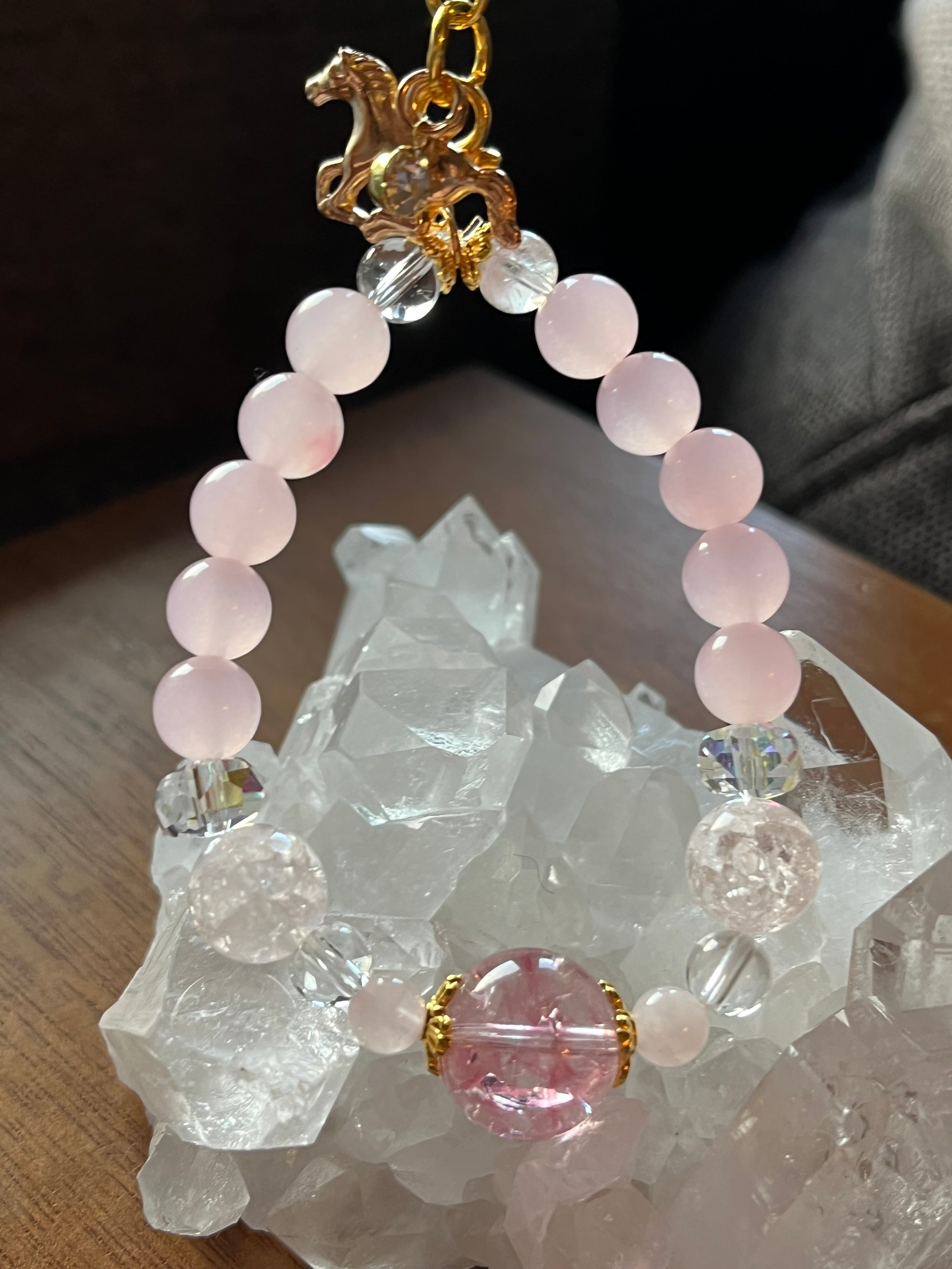 馬の干支モチーフの今年のお守り 火のパワー天然石、 ヒマラヤ水晶、ピンククォーツ 恋愛、愛情アップ、御守り、 パワーアップ、心願成就