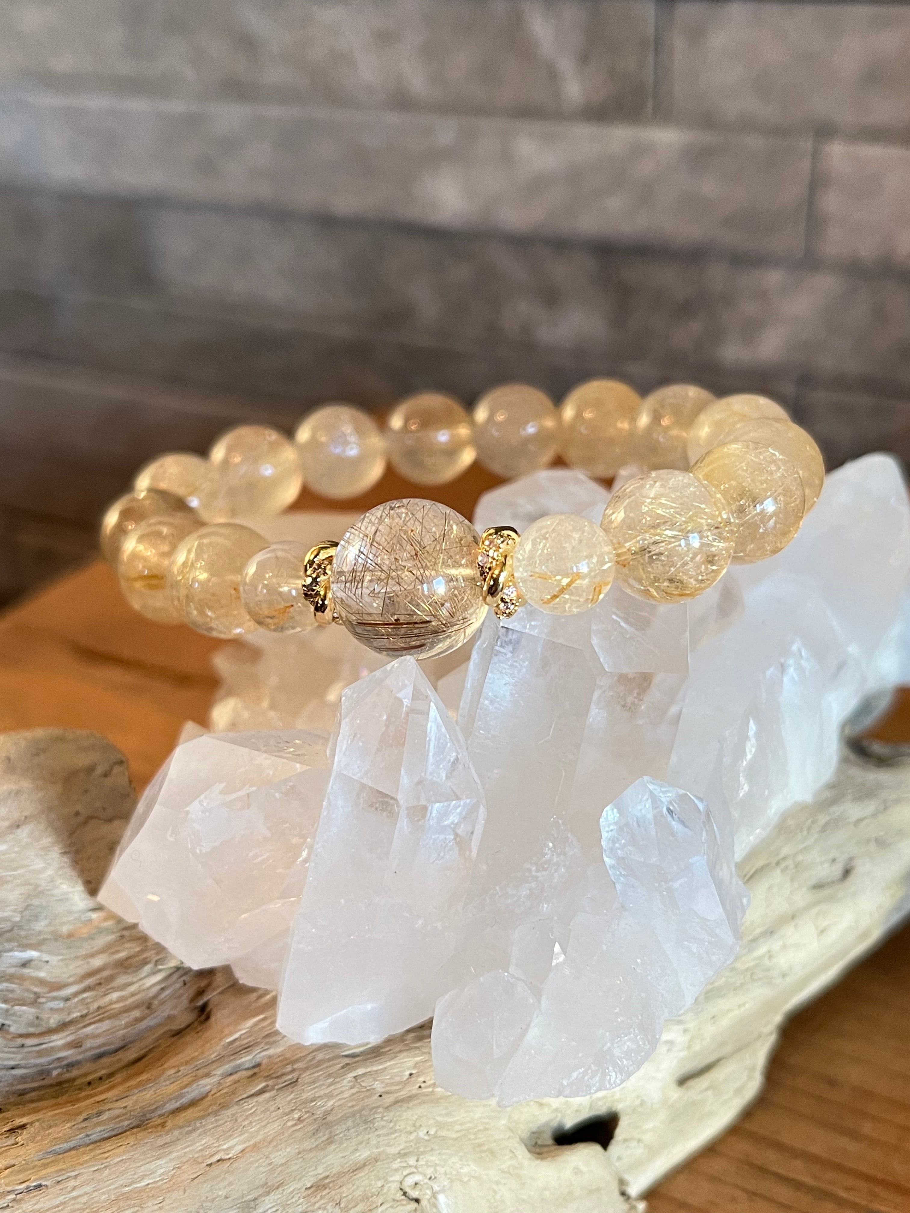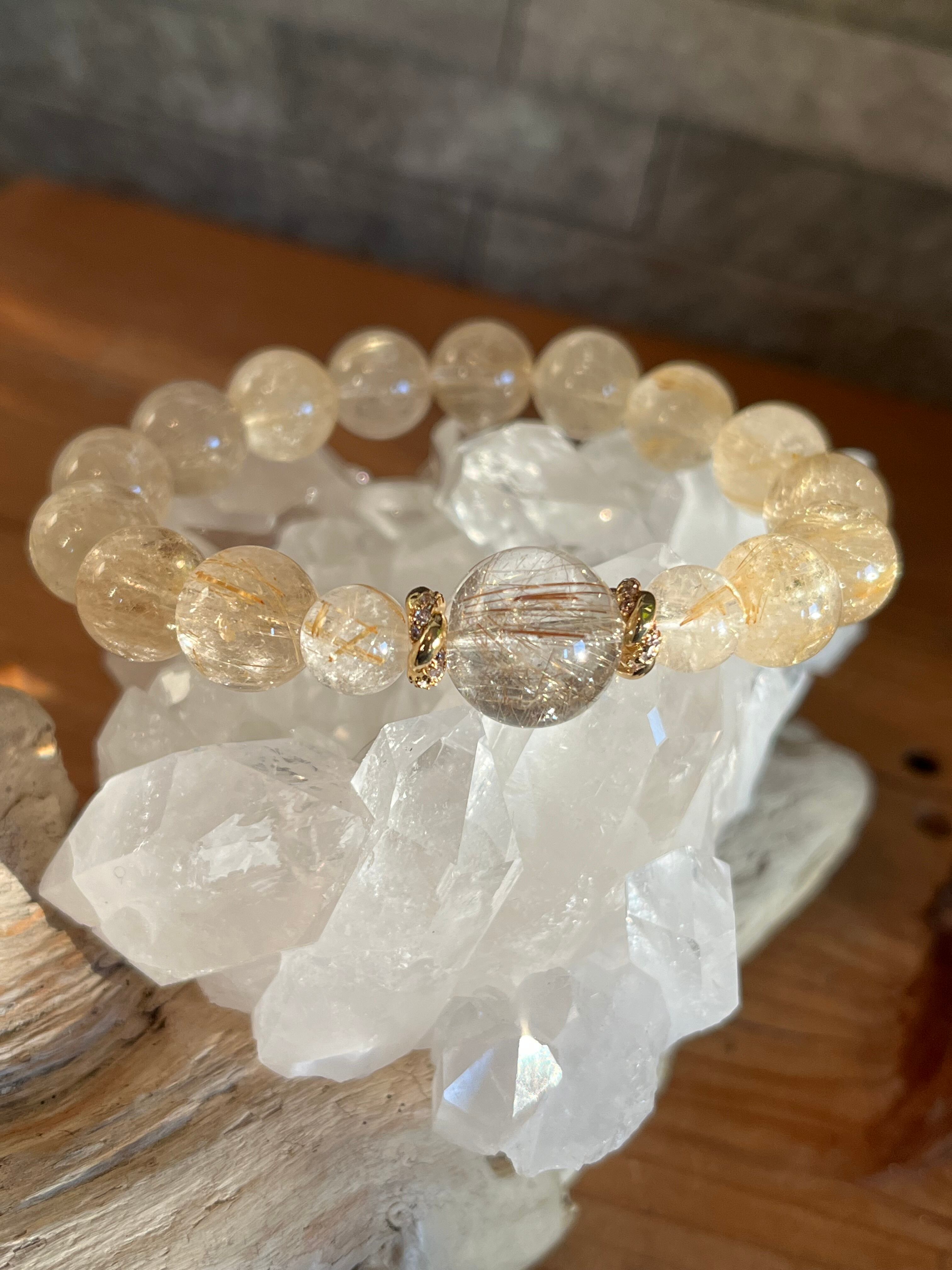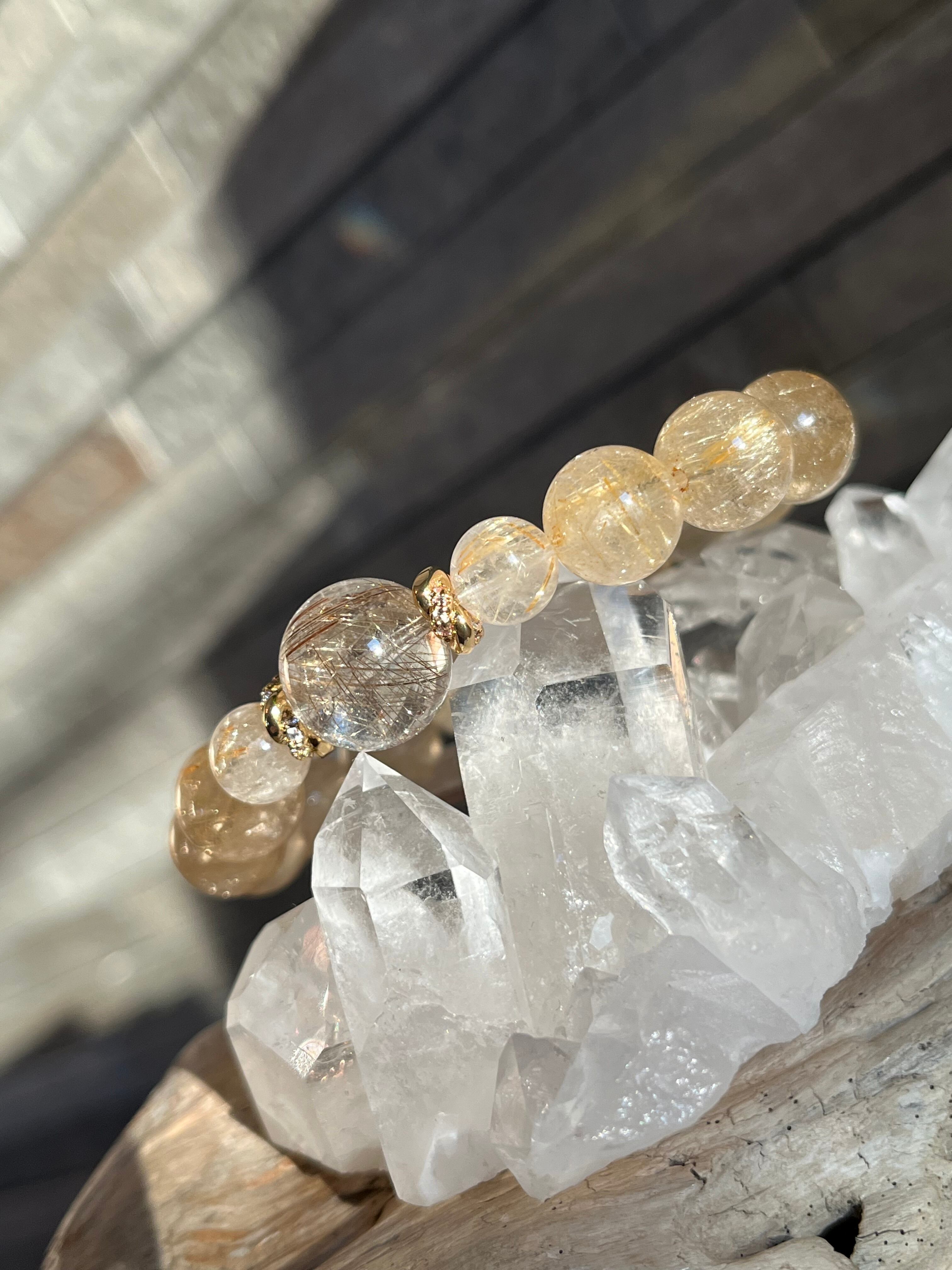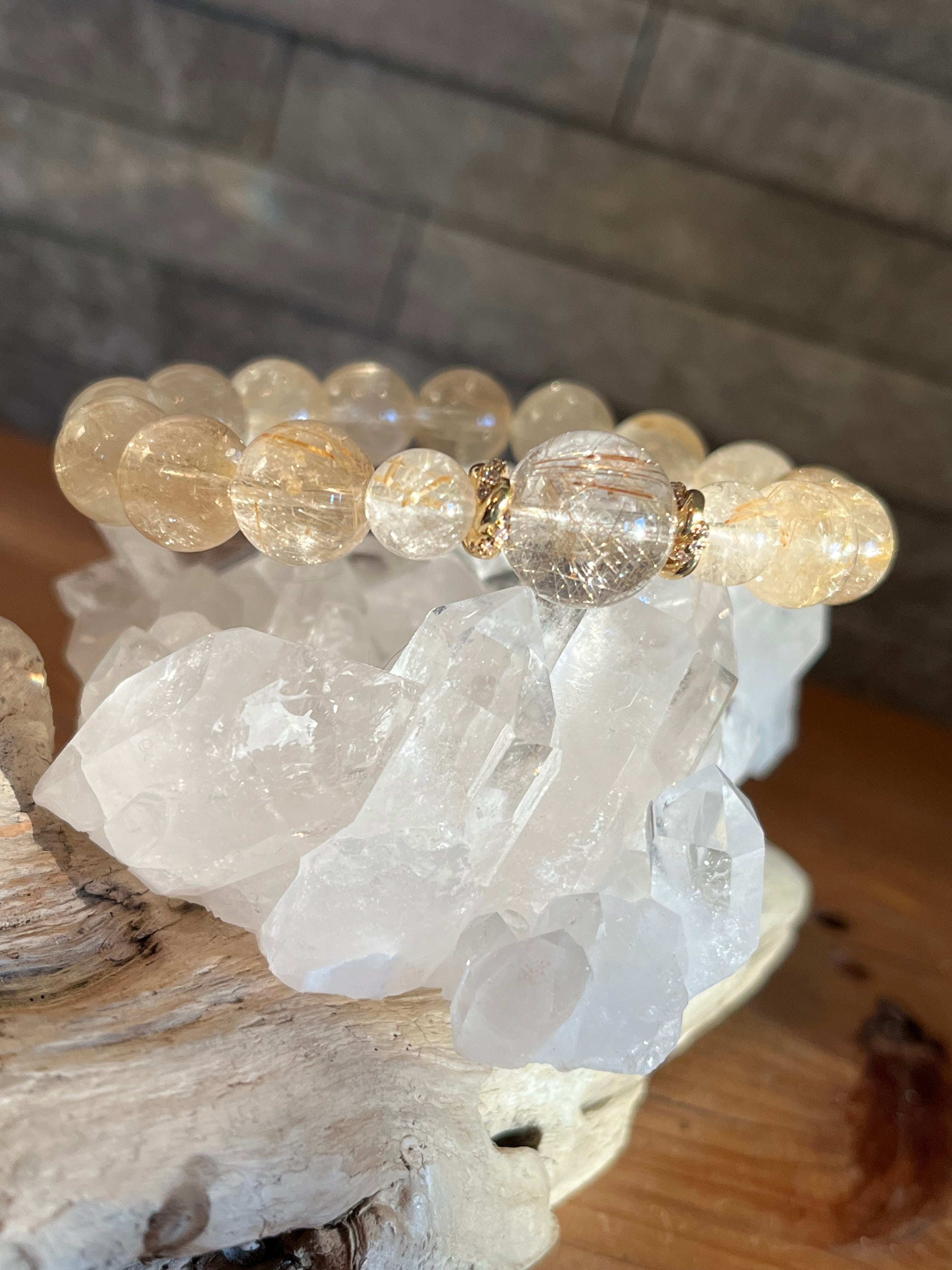 輝く綺麗な金糸が無数に内包された美しいルチルクォーツのブレス。